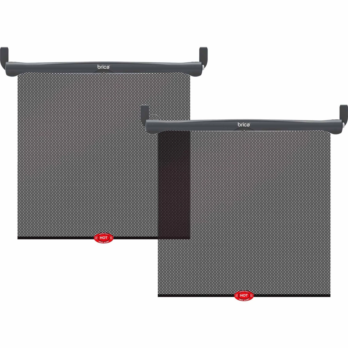 Block the glare and not the view with the Brica by Munchkin Sun Safety Shade’s Safe-View premium fabric mesh. This easy-to-use, retractable car shade blocks the sun and features a White Hot patented heat alert system that turns white when car is too hot. Dual attachment system for a better fit: choose adjustable clips or suction cups. One-push retract button for easy rollup. Model: 61222.