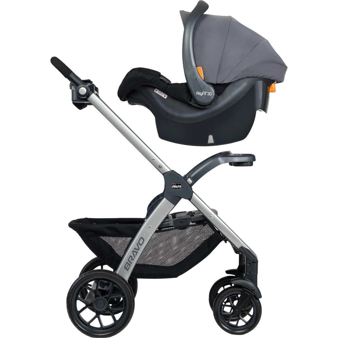 The top-selling Bravo 3-in-1 Trio Travel System from Chicco combines the full-size Bravo Quick-Fold Stroller with the #-1 rated KeyFit 30 Infant Car Seat for streamlined travel. Offering ease-of-use with click-in compatibility, the KeyFit 30 is secured via the Bravo child tray for adapter-free convenience. From a lightweight infant car seat carrier to a full-size stroller, the Bravo Trio Travel System offers 3 modes to simplify travel from newborn to toddler. The removable seat features a one-hand, multi-position recline and the full-coverage, UPF-rated canopy with peek-a-boo mesh window provides privacy and protection from the elements in all 3 modes.