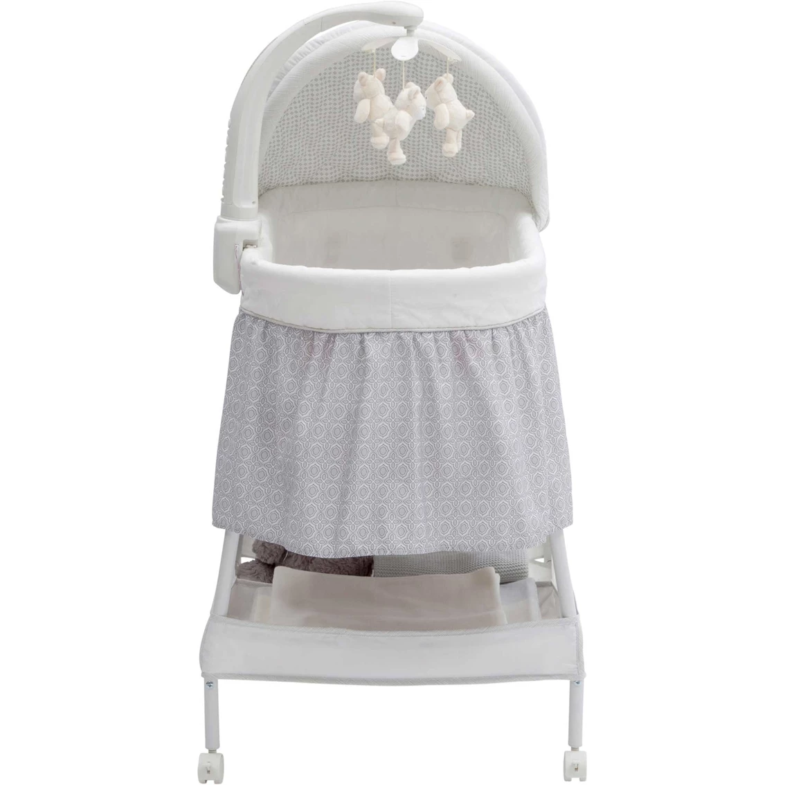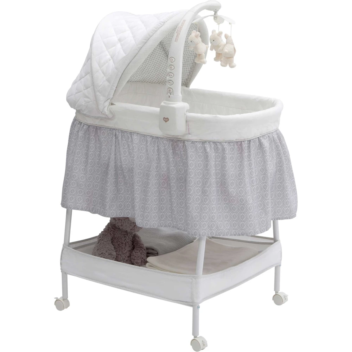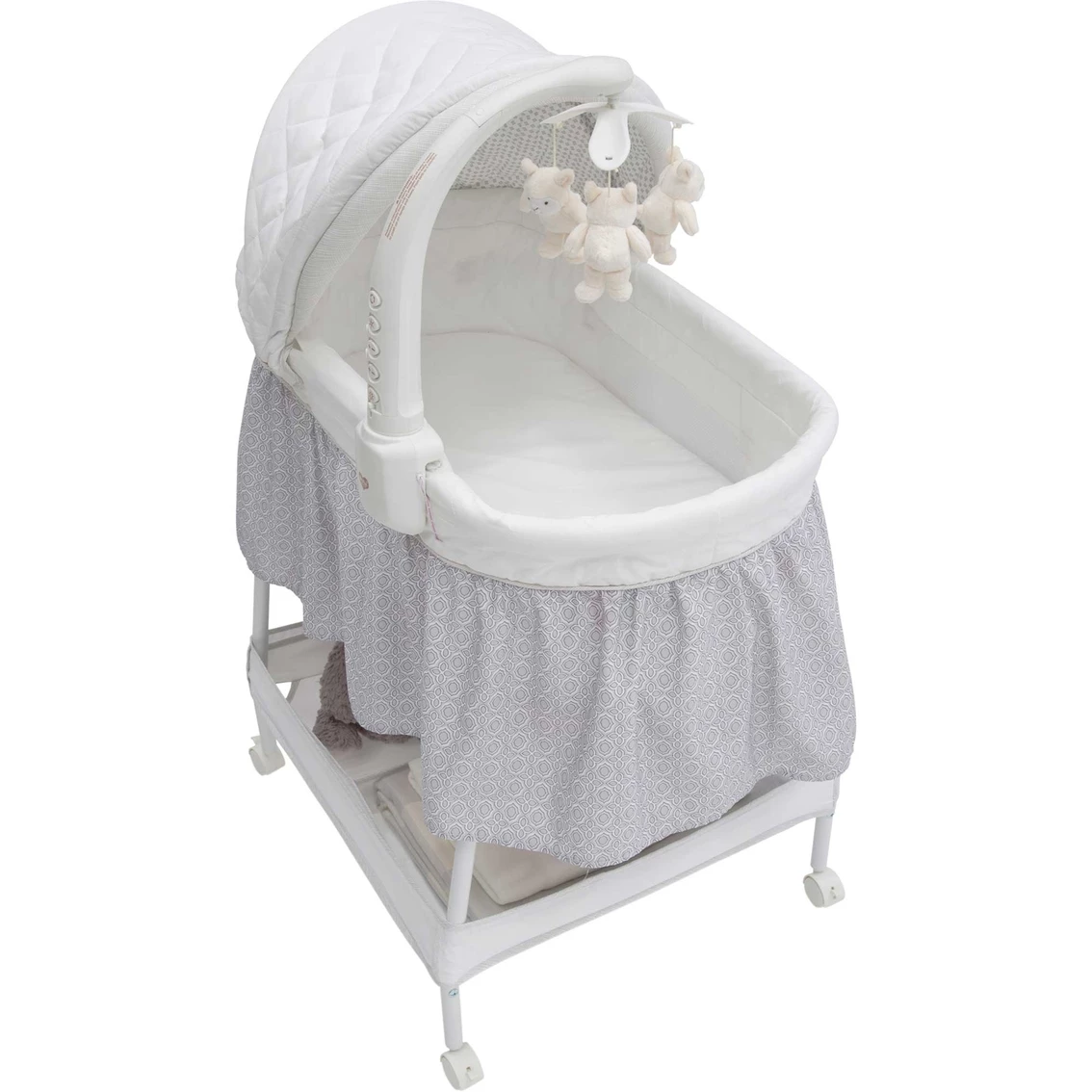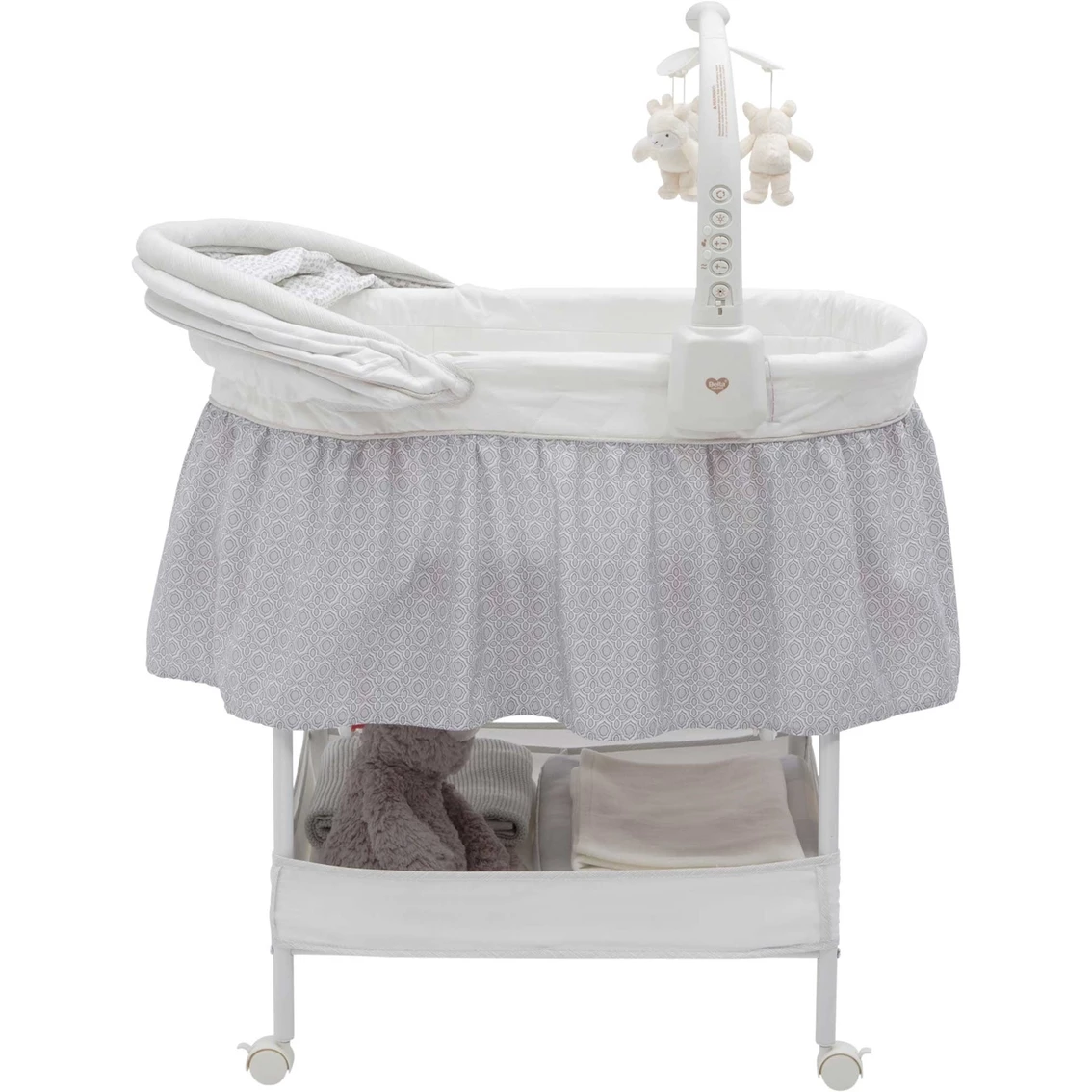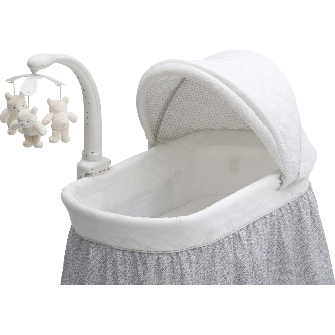 As beautiful as it is practical, the Deluxe Gliding Bassinet from Delta Children will lull your little one to sleep with soothing music, soft nightlight and an electronic mobile accented with three plush bears. This safe, super-cozy bassinet outfitted with swivel wheels makes keeping baby close at night easy, while a large, two-section basket underneath provides extra storage for all of baby’s essentials. Includes a mattress pad and matching fitted sheet. Machine washable fitted sheet for easy cleaning. This bassinet is recommended for babies 0-5 months. Stop use at 5 months or once your infant begins to push up on their hands and knees, whichever comes first. Delta Children was founded around the idea of making safe, high-quality children’s furniture affordable for all families. They know there’s nothing more important than safety when it comes to your child’s space. That’s why all Delta Children products are built with long-lasting materials to ensure they stand up to years of use. Plus, they are rigorously tested to meet or exceed all industry safety standards. Model: 27201056.