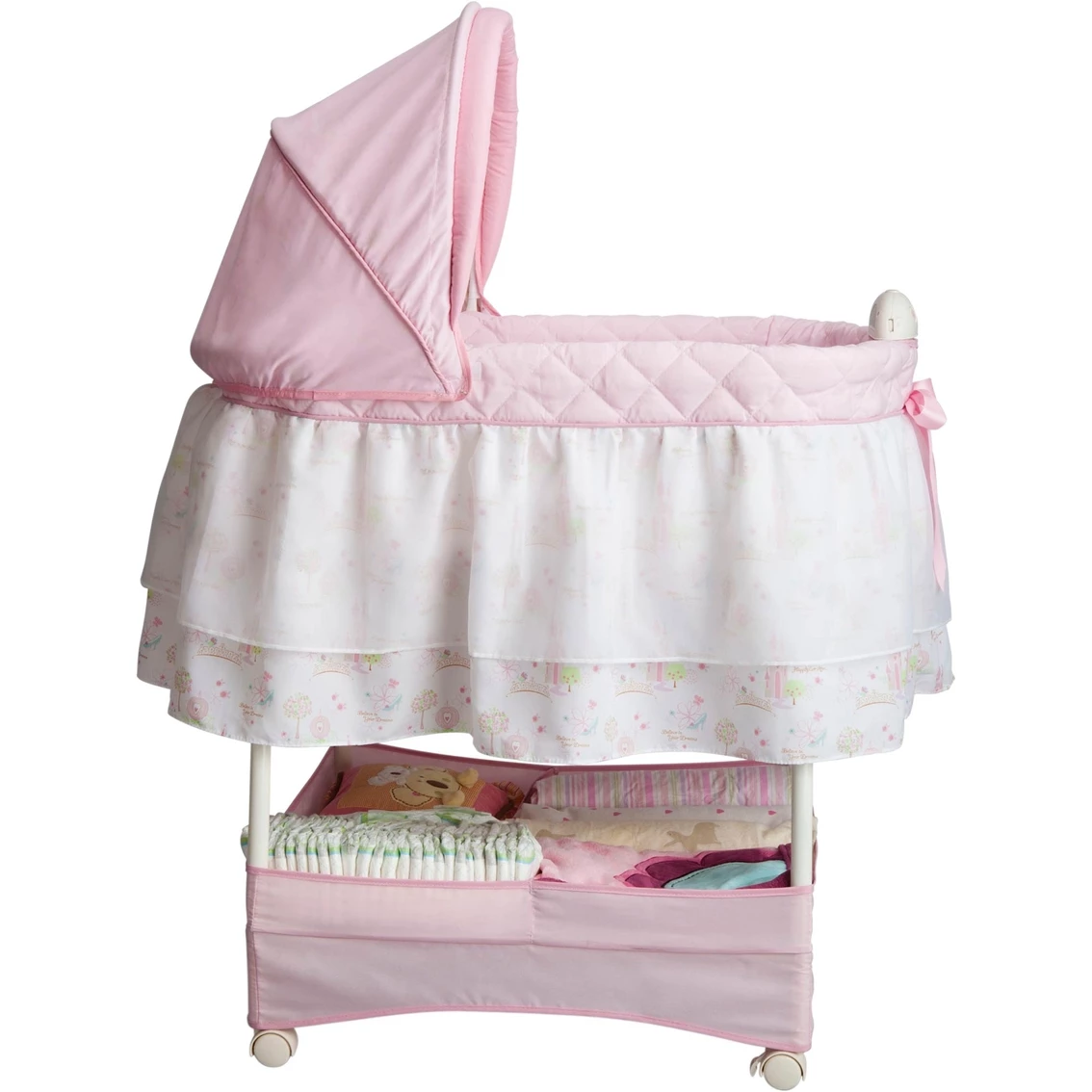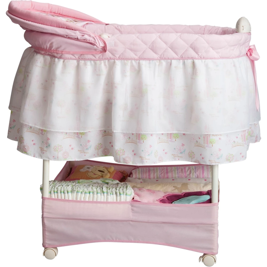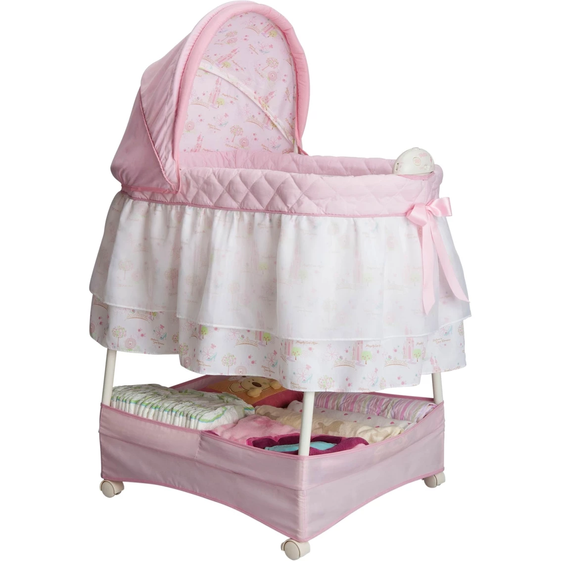 Fit for any sleeping princess, this Disney Princess Gliding Bassinet boasts magical Disney graphics, a sweet satin bow, and an electronic music module. The module plays soothing lullabies, plus emits a soft light and gentle vibration.