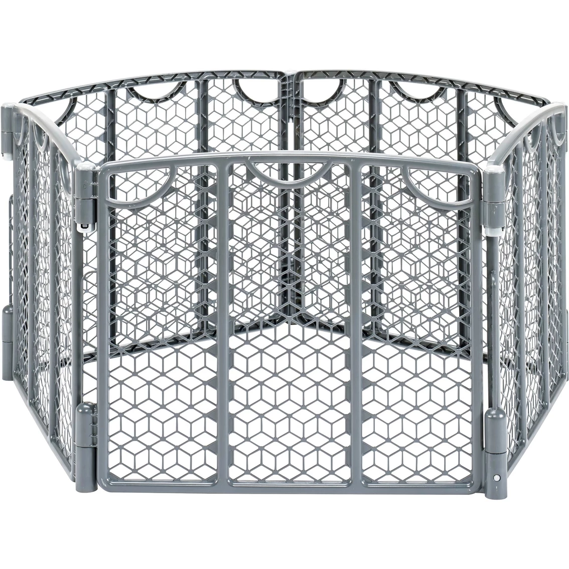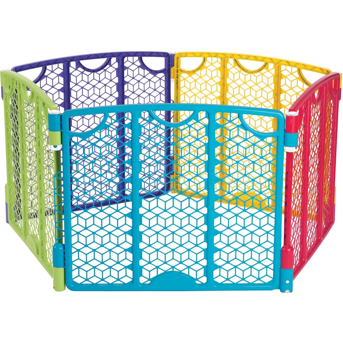 Designed for both indoor and outdoor versatility, the Versatile Play Space from Evenflo offers over 18.5 square feet of safe, enclosed fun! Exclusive reversible legs have outdoor stakes for lawn stability and anti-movement/non-scratch floor pads for any interior floor surface. Quick and easy set up and fold, with a unique hinge design – simply unfold and connect together the six interlocking UV weather resistant panels. Smooth edges and molded handle making it easy to take anywhere for safety on the go. No tools required!
