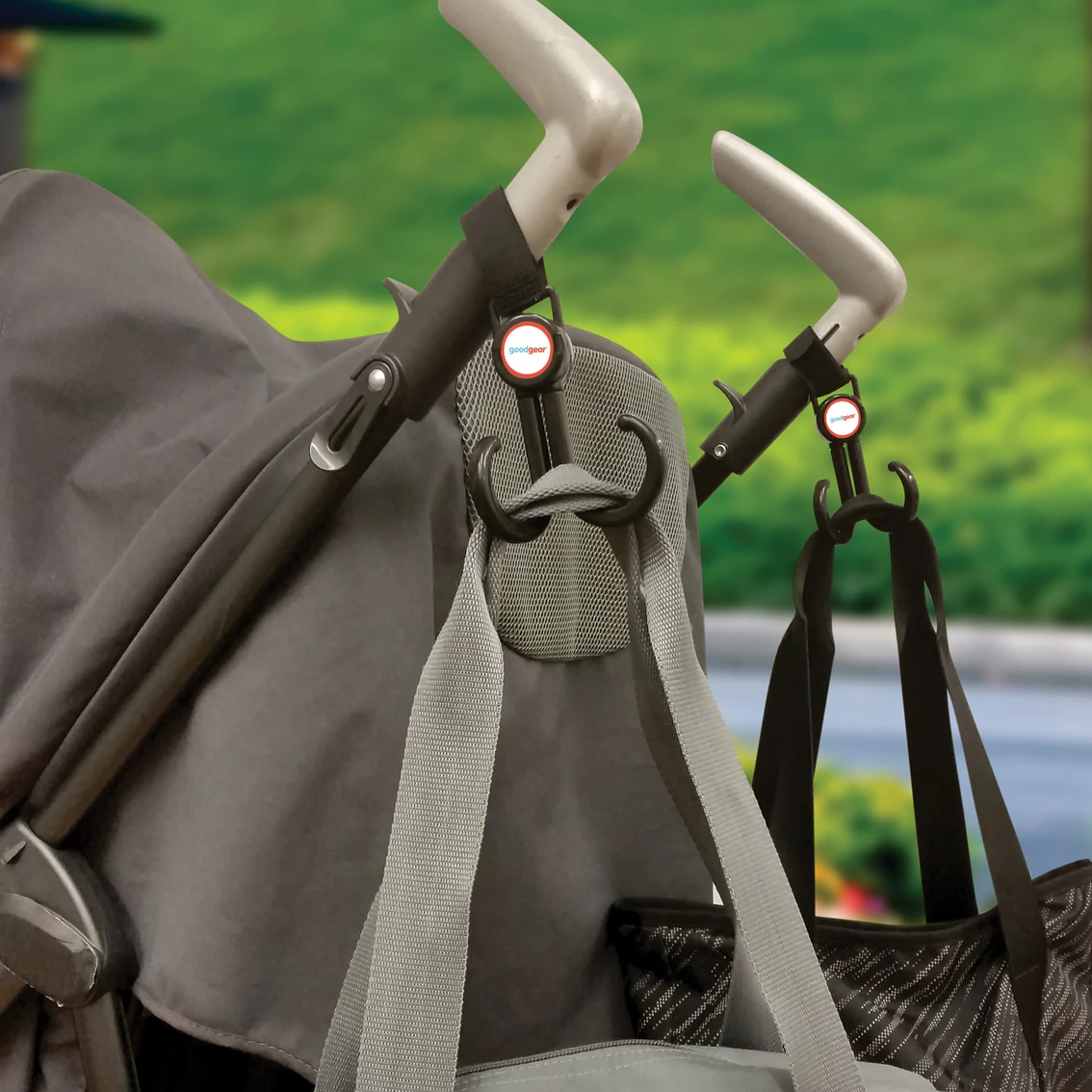 These Stroller Hooks install in seconds, horizontally or vertically. Can be used on strollers, shopping carts and more. The hooks swivel 360 degrees and have fully adjustable straps to accommodate all stroller makes and models. Model: 170011.