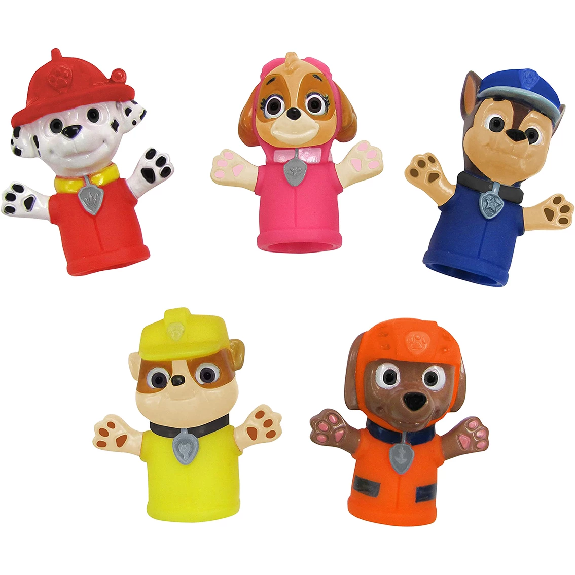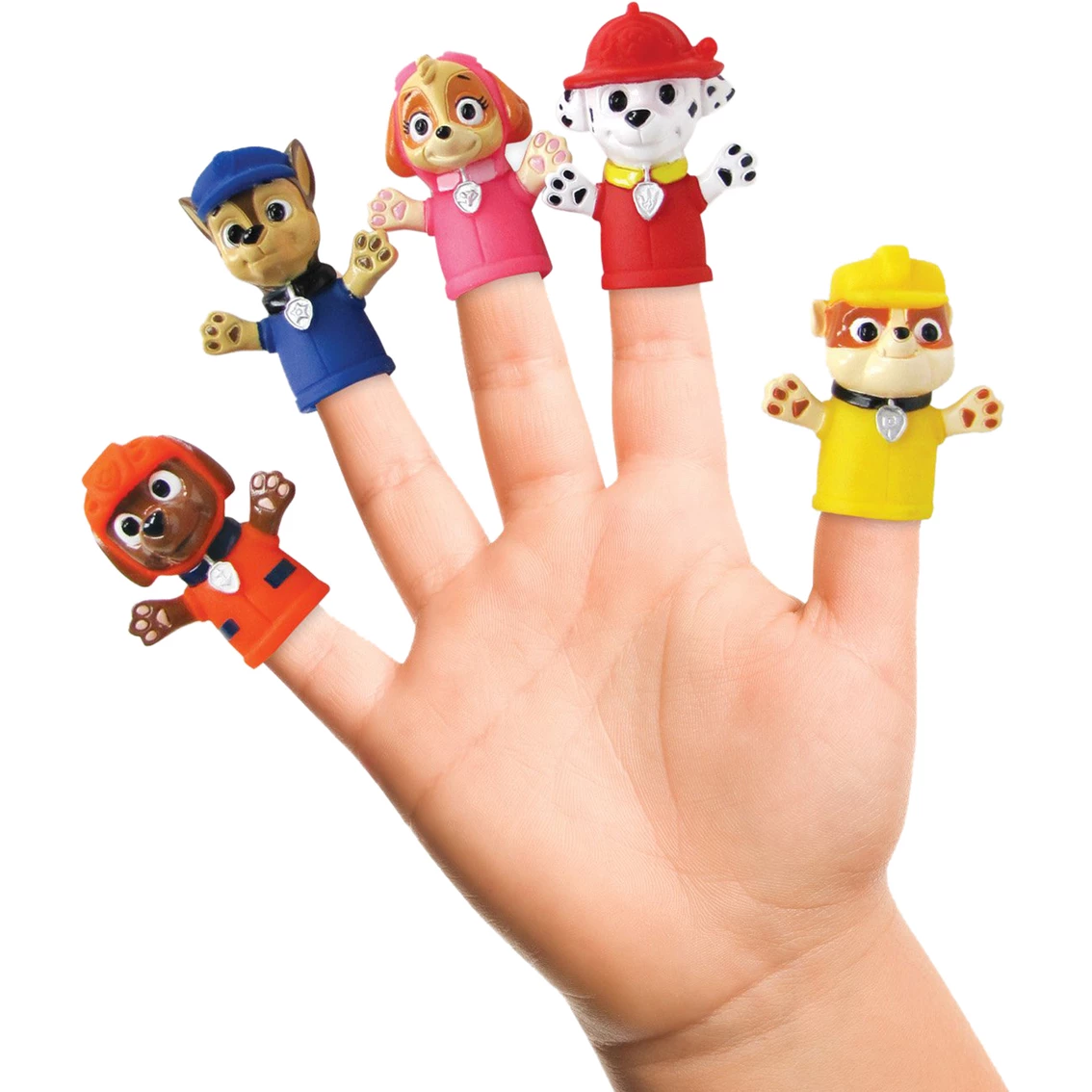 PAW Patrol Dream Team has arrived ready for their adventure puppet show to begin. Imaginative stories await with Chase, Marshall, Skye, Zuma and Rubble. All 5 characters are decorated in bright colors for countless hours of play and fun. Also great for themed party favors! Includes 5 characters. Makes bath time fun, educational and playful. Bright colors and friendly faces. Made for ages 3 years +. Crafted of PVC. Wipe clean. Model: 58527.