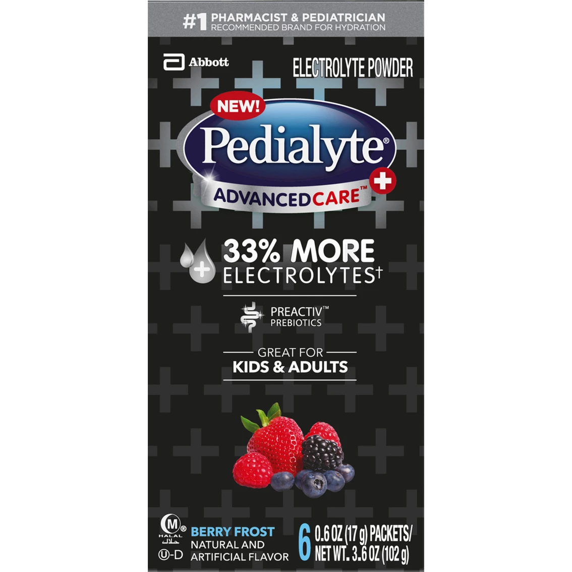 Pedialyte AdvancedCare Plus is formulated to replenish more of the electrolytes you may lose due to vomiting, diarrhea, or extreme perspiration caused by excessive heat or prolonged exercise. Pedialyte AdvancedCare Plus also has PreActiv Prebiotics to help promote a healthy digestive system. Pedialyte AdvancedCare Plus Electrolyte Powder, with 33% more electrolytes and PreActiv Prebiotics, Berry Frost flavor. Includes Electrolyte Drink Powder Packets, 0.6 oz. each, 6 Count. Model: 66969.