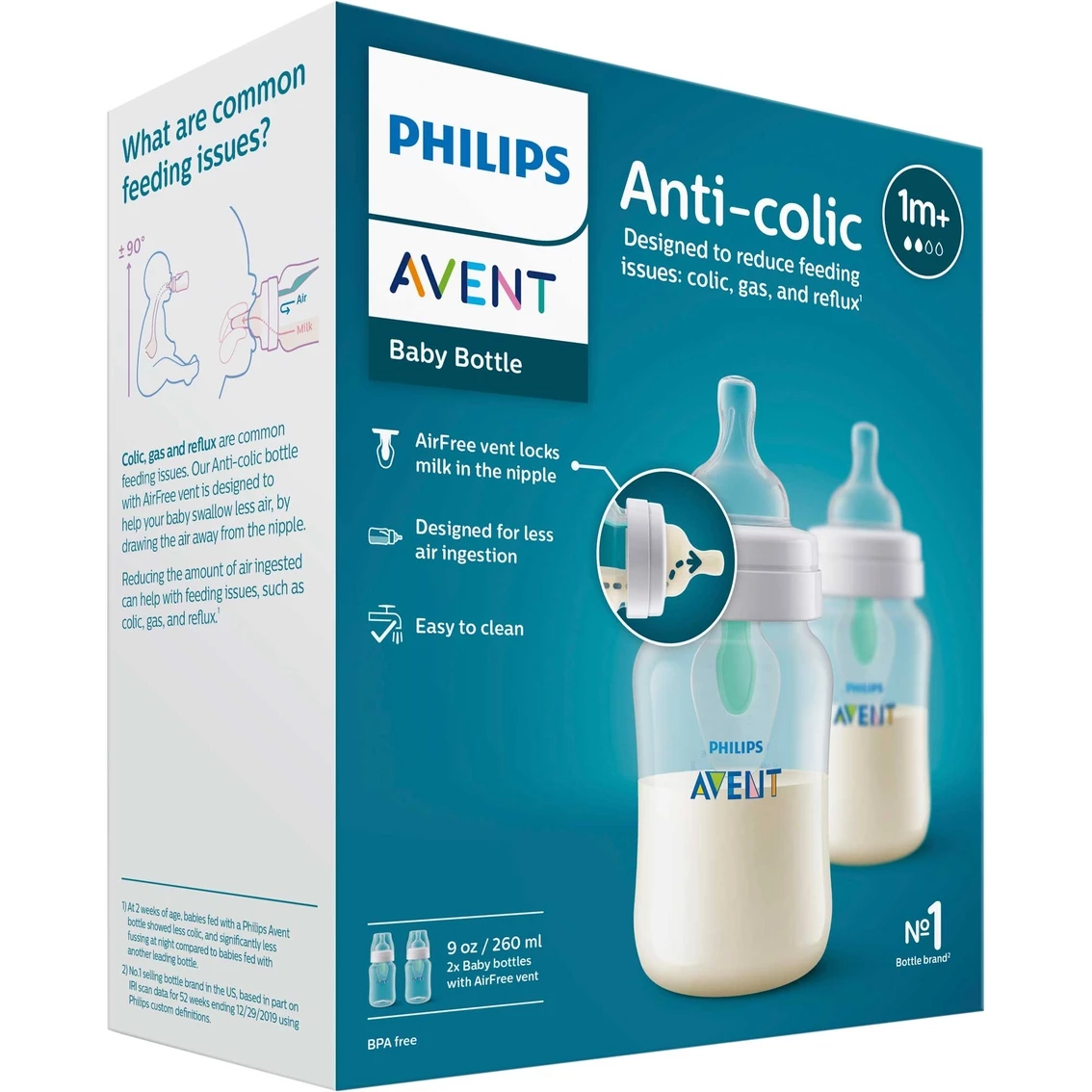 This pack includes two 9-oz. Philips Avent Anti-colic bottles with AirFree vent. The bottles are designed to reduce most common feeding issues: colic, gas and reflux. The AirFree vent keeps the nipple full of milk, not air. The vent is one piece, so it is easy to clean. Model: SCY703/02.