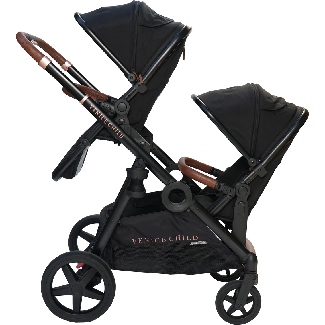 In today’s world, modern parenting requires modern products that help to make life easier. Venice Child is proud to bring forth a new era of parenting products specifically designed to provide parents with simple, durable and high-quality solutions that make their day to day lives less strenuous. With the Maverick Stroller by Venice Child, you can rest assured that you’ve got the right product at the right price, loaded with all of the right features. This stroller includes an additional 2nd Toddler Seat so that 2 children can ride together. A rain shield for inclement weather, car seat adapters and seat extension adapters are included. This stroller comes with an easy-entry, extra-large storage basket with built-in pockets, an easy-remove front belly bar and a parent cup holder for parental luxury. Telescoping, a comfort grip handle, high-quality, shock-absorbing wheels, 3-position recline and padded shoulder straps allow for comfortable, smooth riding, while reversible seats, stage extendable UPF 50 canopies and a one-foot linked brake are all built in for safety. Wow, everything all packed into one stroller. Model: VCHD-MV303.